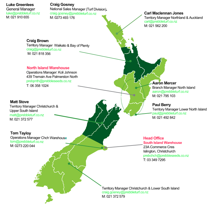 Email Links South Island: prebchch@prebbleseeds.co.nz North Island: prebpnth@prebbleseeds.co.nz Luke Greenlees luke@prebbleturf.co.nz Craig Gosney craig.gosney@prebbleturf.co.nz Carl Maclennan Jones carl@prebbleturf.co.nz Craig Brown craig@prebbleturf.co.nz Paul Berry paul@prebbleturf.co.nz Aaron Mercer aaron@prebbleturf.co.nz Matt Stove matt@prebbleturf.co.nz Tom Talyor tom@prebbleturf.co.nz