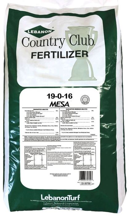 Country Club Mesa 19-0-16 is recommended in any turf situation where benefits of a nitrogen package in a 1:1 combination with sulphate of potash is desired. 100% of the nitrogen is derived from MESA, Lebanon Turf�s patented technology. MESA provides the deep green initial response of sulphate of ammonia and the long term response of methylene urea in a homogeneous granule.
