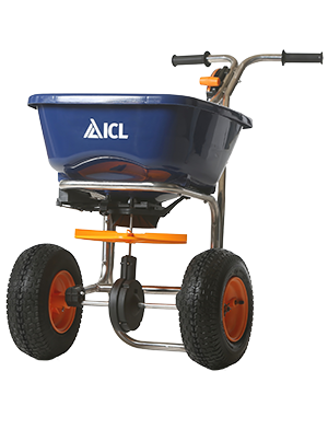 5: Spreading material: Push the spreader at a brisk walking speed of approximately 5 km/h, always keeping the impeller parallel to the ground. With the upper gauge and the SmartSpread™ lower gauge set in the desired positions, push the handlebar on/off lever forwards to the setting stop, while simultaneously starting forward motion. Always begin moving forward at the same time as pushing the lever forward to the on position. At the end of each run, pull the on/off lever back to the zero position to stop material flow and cease spreading. The spread width of the material varies with different fertilizer types. Always check the spread width of the product to ensure correct spread distances. Detailed information on the spread width of specific fertilizers can be found on the ICL websites or through ICL appointed retailers.